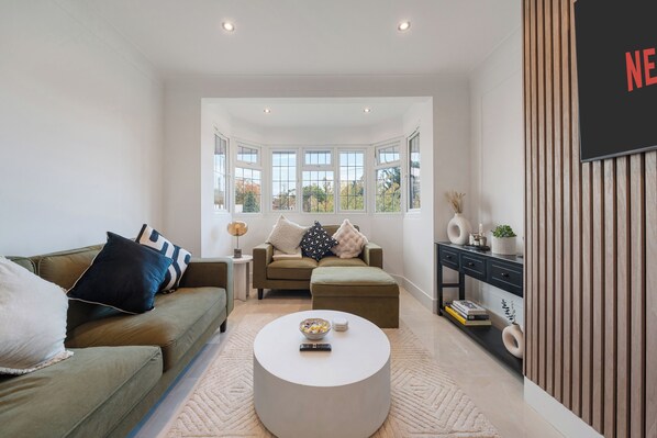 Plush Modern Living Area: Unwind in the cozy living room, featuring plush seating and a large TV with Netflix, perfect for relaxing after a day out.