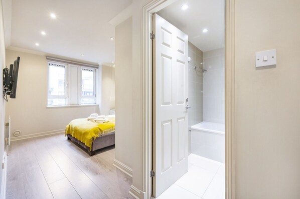 There are three separate bedrooms (two with a king size bed and one with a single size bed), with nightstands, bedside lamps and plenty of storage space. The apartment features 2 bathrooms; one of the 2 bathrooms are en-suited to one of the double bedrooms (one full with a combination bathtub/shower, one half with shower).