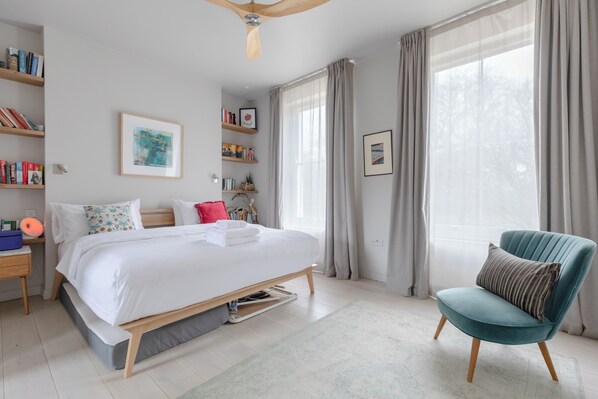 Spread across the first floor, this incredibly spacious master bedroom boasts a comfortable super-king sized bed, large built-in wardrobes, SONOS speaker, ceiling fan, and plush lounging chair. The adjoining en-suite bathroom boasts both a huge sunken bath-tub, separate rain shower, and a view over the private garden and patio.