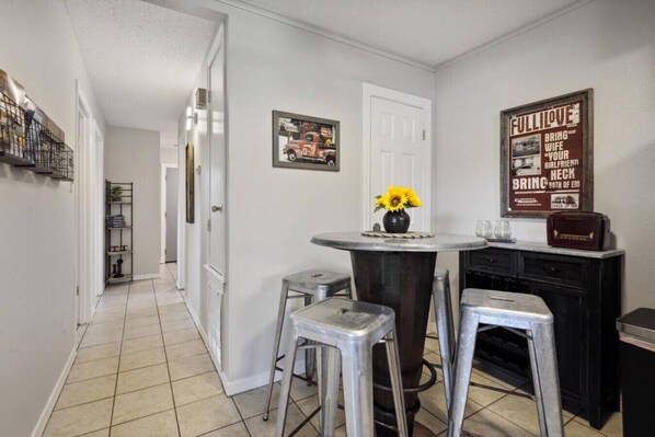 The kitchen is equipped with new stainless appliances and fully stocked with all that you will need to cook a meal for those nights you want to stay in and relax.