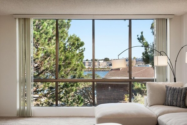 ➞ Relax in the spacious living room with a comfortable sofa, large TV, and stunning marina views.