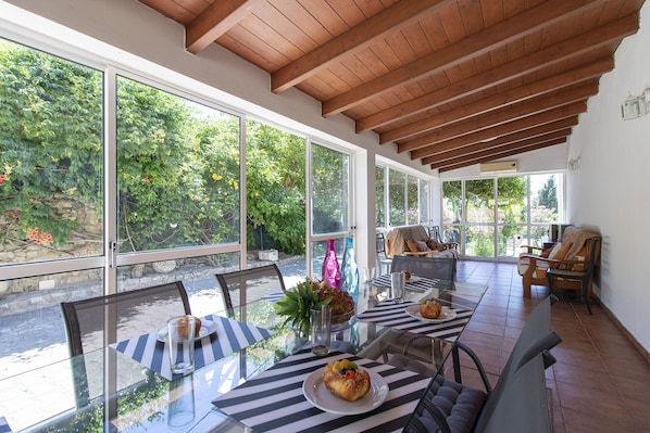 Step inside to three air‑conditioned bedrooms arranged for comfort: on the first floor, two en‑suite double bedrooms; on the ground floor, a twin bedroom supported by a separate bathroom with shower. The kitchen is spacious and well-equipped with all the utensils you might need for simple, home‑style meals, and includes a table for six, so everyone can eat together comfortably.