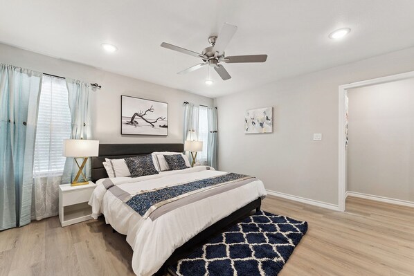 Welcome to your private, townhouse! This modern 3-bedroom, 2-bath home features a 1 KING bed in the master and 2 QUEEN beds in the additional bedrooms, perfect for families or groups. The spacious open floor plan includes a fully equipped kitchen and a large, cozy couch for everyone to gather. Enjoy free Netflix, local channels, and a 4-to-Score game set, along with chess for some indoor fun.