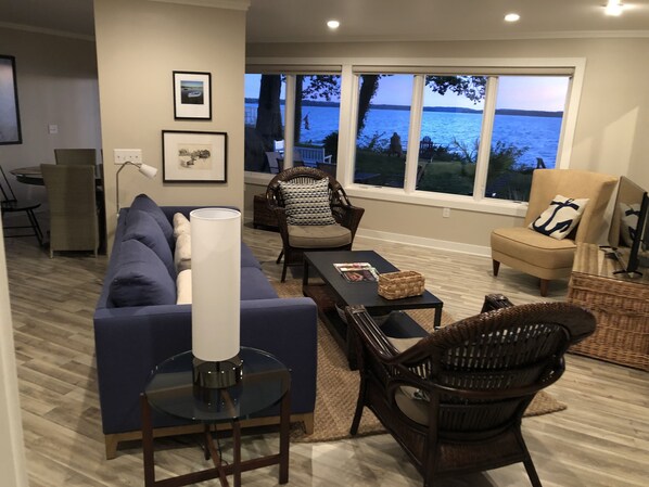 The living room, dining room, kitchen, first floor bedroom and the upstairs master bedroom have lake views and unparalleled sunsets.