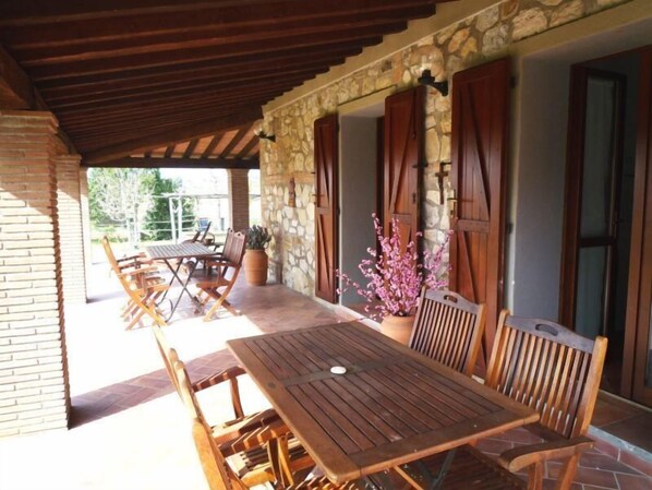 Farmhouse on the top of a hill close to Magliano in Toscana. Charming country house situated in a panoramic position, which thanks to careful, expert restoration work has been converted into three cosy apartments, two of which are available to guests. From the house, which is situated on the top of a small hill surrounded by corn fields, you can admire the Tuscan village of Magliano in all its beauty.It is an important village of Etruscan origin, which in 1400 becamea strategic medieval town protected by its strong, characteristic circularwall. To reach the house you have to drive a 300 m. unmade road. The Uccellina Natural Park and the Argentario Sea. The ideal geographic position of the house enables an interesting,varied holiday to be organised, not to be missed for exampleis a visit to the Uccellina Nature Park, Orbetello's natural oasis orrelaxing days basking under the hot sun on the beaches of theTyrrheanian coastline and chic evenings sight seeing and shopping inthe renowned tourist centres of Argentario. Close to the house,there is a good sized garden shaded by pine trees and equippedwith garden furniture wood burning oven and a barbecue. Furnishingsare tasteful and of good quality. In the garden, there is also a beautiful biological vegetable garden where our clients could go and taste seasonal fruit and vegetable. Sheets and towels not provided