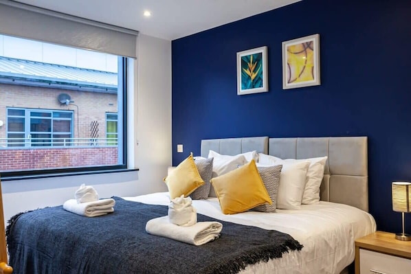 The beautifully designed interior has been finished to a high standard, featuring stylish furnishings and contemporary fixtures throughout. The spacious open-plan living area includes a fully equipped modern kitchen with everything you need to prepare meals at home, a dining table, a comfortable sofa and armchair, and a Smart TV. High-speed broadband is available throughout the apartment, along with access to streaming and catch-up TV apps. The generous bedroom offers ample storage and a luxurious king-size bed dressed in crisp hotel-quality linen. The sleek family bathroom includes a powerful shower, toilet, and sink, complemented by fluffy towels and complimentary toiletries for your convenience. There is a sofa bed for 1 person in the living area that can be made up upon request before arrival, for an additional fee (please select 3 guests when booking).