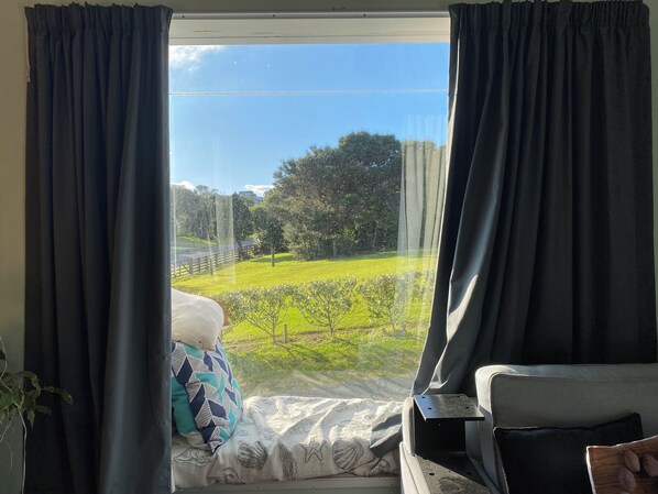 Bach has two bedrooms, plus 2 sleepouts. Master bedroom with access to deck has a queen bed and TV with chromecast. 2nd bedroom has king single trundle bed. Sleepout 1 has queen bed and ensuite. Sleepout 2 has double bed and ceiling fan and tv.