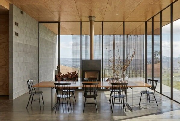 Mansfield House presents a panoramic view across the rugged and expansive landscape of Taungurung country – this terrain and its unruly weather conditions are formative to the home’s design. The north-facing half of the house features double-glazed, floor-to-ceiling windows on three sides, framing the most exquisite views. “To the east is Mount Buller, and then to the west you get these crazy sunsets and when the lake’s full you get to see [Lake] Eildon,” Robbie explains. A concerted effort was made to privilege the vast scenery with minimal obstruction from the building.