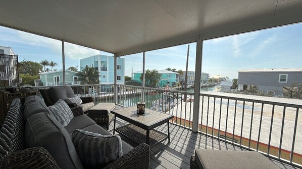 - Screened-in balcony with beautiful views of the canal and dock