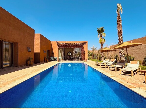 Composed of 3 beautiful bedrooms with their bathroom offering a warm space to all. A swimming pool invites you under the Moroccan sun.