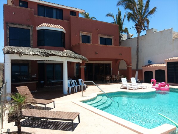 Stay comfortably in sunny Mazatlan. This beautiful, Spanish style, oceanfront home has amazing views, an infinity pool, heated Jacuzzi, PURIFIED water, barbecue area and a yard! Located in New Mazatlán, north of the main city and close to the Surf’s Up café. It is a quiet area with an uncrowded, nice, sandy beach. The main Malecon is about a 20+ minute drive, however, this house features it’s own mini Malecon on the beach. Internet & Entertainment – The WIFI is 2.4 & 5 Ghz, user names – Casa de la Rana (main) & Casa El Delfin (extended), same PW. The Living room has a 70” 8K HD TV with a special streaming TV box that gets over 2,000 channels. There are over 150 DVDs and over 150 books, plus other games. The game room has a 50” TV connected to the WIFI. Rooms – The first floor has the living room, kitchen, dining area and a half bathroom. The living room has three large couches and one is a Queen size hide-a-bed. The laundry room has a washer, dryer and a work desk with a monitor and printer. Bedroom #1 is off from the kitchen, it sleeps 2 on a Queen size bed and it also has access from the outside. The full bathroom can be made private or shared with the house. The outer bedroom has a full bathroom and only has access from the outside, it sleeps 2 on an USA queen size bed. On the second floor there is a nice Master bedroom with a great view. It sleeps 2+ on a king size bed, has a large walk-in closet with a security safe, a massage table, a His and Hers double bathroom with a large walk-in shower and a Jacuzzi bathtub. Bedroom #2 has a full bathroom, it sleeps 2 on a Queen size bed. The game room doesn’t have a bathroom, but can sleep 2 on a Queen size hide-a-bed. On the third floor is bedroom #3 has a full bathroom, it sleeps 2 on a Queen size bed. It also has a work desk with a great view. There is also a large roof terrace on the 3rd floor. There is another small room with a bathroom by the garage, it is for a live-in maid, but may be available for guests.