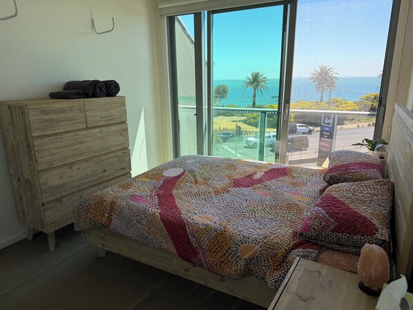 With a glimpse of Port Phillip Bay from the bedroom and a sunny east-facing balcony, this home is ideal for couples, solo travellers, or visitors wanting to enjoy the best of Melbourne’s Bayside suburbs or take a short trip into the city.