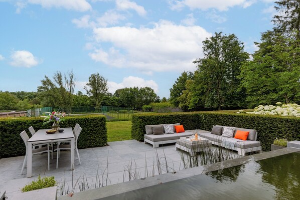 Outdoors, you’ll find two additional recreation areas by the swimming pond with picnic tables, sun loungers, and a small boat.