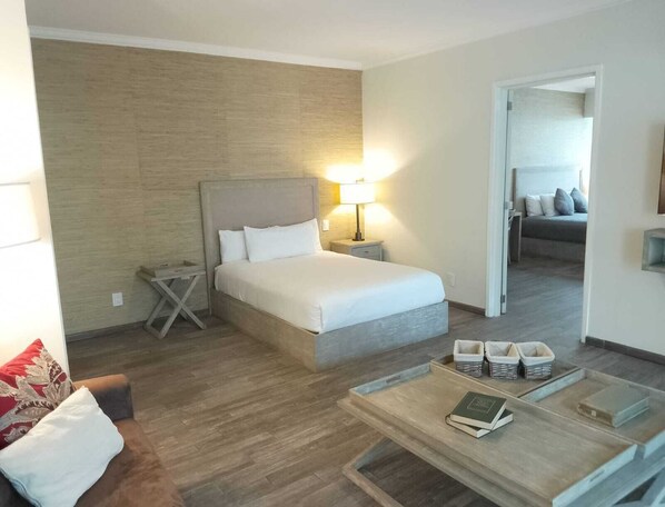 The connecting room offers a peaceful retreat with a comfortable king-sized bed, a spacious closet, and an ensuite bathroom. Meanwhile, the studio room features its own bathroom with a shower.