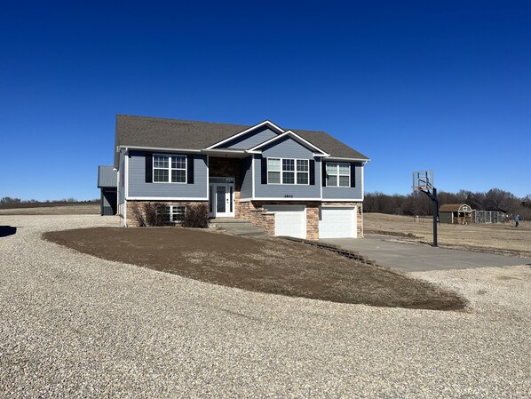 Country home with lake access and game room.
