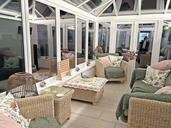 Bathroom: Bath, Cubicle Shower, Toilet. Oil central heating, gas, electricity, bed linen, towels and Wi-Fi included. Travel cot and highchair. Welcome pack. External orangery.. Enclosed back garden with patio and BBQ. Wood-fired tub for 4 (private). Electric vehicle charging point. Private parking for 2 cars. No smoking. Please note: There is a step in the garden.. Completely refurbished for 2023, this property will delight all who stay. On one level, this cosy cottage features a charming living area with original beams, a wood burner, comfy seating for four, a Smart TV, books, and board games, perfect for relaxing after an activity-packed day. It will be a pleasure to cook up a feast in the country-style kitchen with all modern conveniences. A large heated conservatory overlooking the garden with plenty of seating for the whole family is just across the courtyard from the kitchen. The garden to the rear is primarily laid to lawn and features a brick barbecue, patio with garden furniture and a wood-fired hot tub with views over the countryside.
