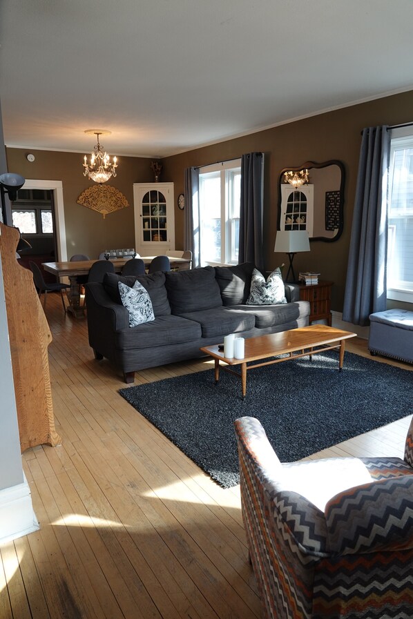 Our 3rd Street Inn sleeps 9 people comfortably. Two bedrooms have new queen size beds and the other bedroom has a bunk bed with a twin over a full. The 4th bedroom is a pop up room with a queen size air mattress. The living room has a new queen sleeper sofa. Take a warm bath in the old fashioned claw foot bathtub, or a shower in our newly remolded lower level bathroom. Whip up some yummy meals in our fully stocked eat-in kitchen with stainless steel appliances & gas range. The dining room seats six without the leaves in the table. There are two leaves. Living room has a 40 inch TV with cable and Netflix. Hook up your iPod to the dock and enjoy your own playlist. We have on site laundry. A lovely back yard with patio furniture and table & chairs. There is a gas grill located on the back patio as well.