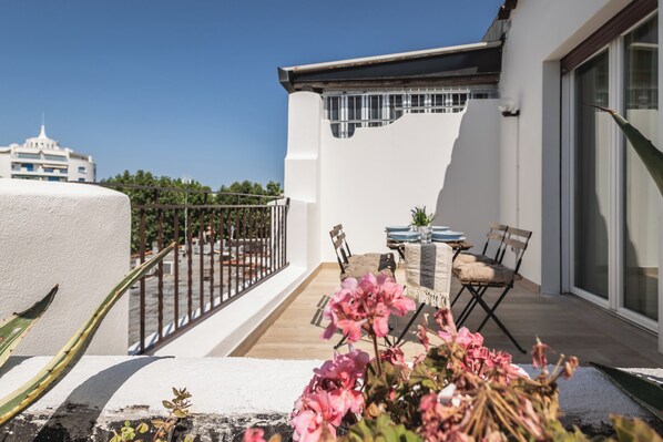 Furnished balcony with table and chairs, perfect for breakfast or meals with a harbor view