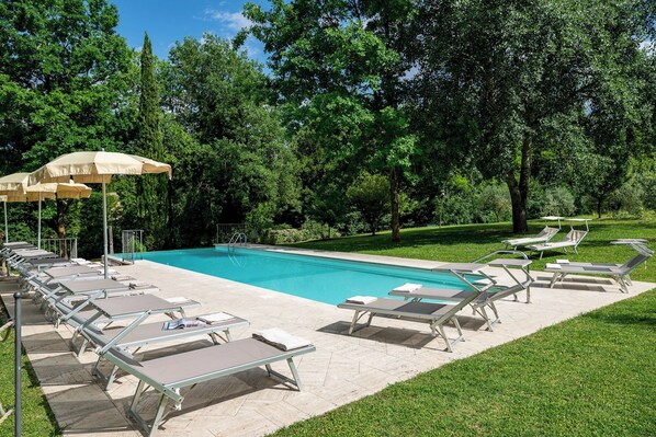 In front of the villa, positioned among the walls of the old trench where the water was collected and, via a channel, sent to the watermill, there is the new scenic and infinity swimming pool, open from the last Saturday in April until the first Saturday in October. It is only few metres from the house, in a dominant position with respect to the property and is reached via a few steps or more easily across the lawn. The rectangular-shaped pool is equipped with Roman steps for access to the water and a cold-water shower. It measures 5 x 18 m with a depth varying from 1.20 m to 1.60 m. It is not a normal pool chlorine, but a swimming pool with salt. This disinfection system is a lot more healthy, no chemicals added. Among the advantages: less red eyes, the tan is better maintained and of course it is easier to swim. The water taste slightly and pleasantly salty. The pool is lined with PVC and is equipped with lighting, the solarium area is paved with travertine. It is provided with sunbeds, deckchairs, umbrellas and small tables. Not far from the edge of the pool, under the old oak tree, a relaxation area has been set up with a comfortable lounge suite.