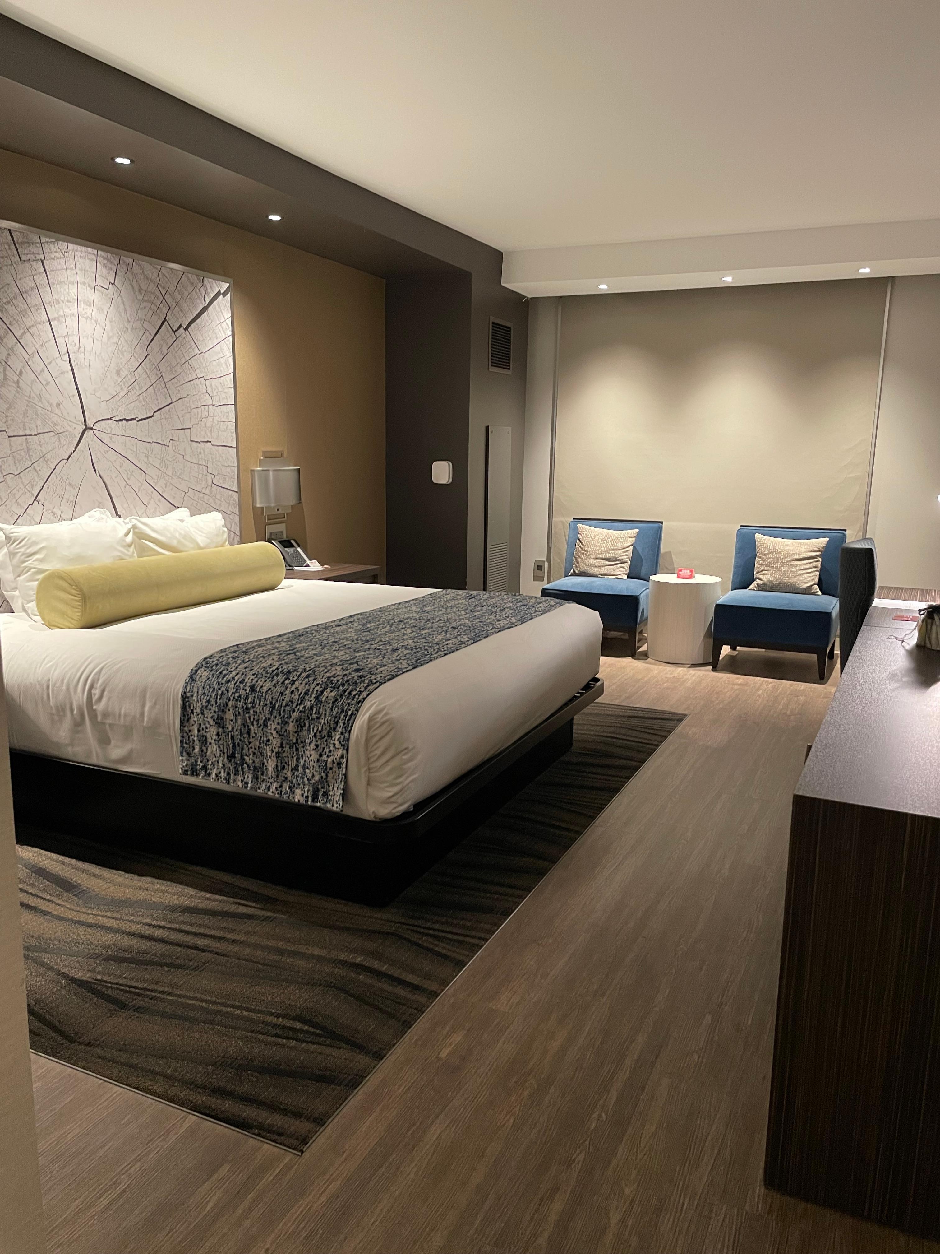 The hotel is super clean and modern. Loved the electric blind shade and maid notification by the door. Would definitely stay there if in the area again. Great selection for dining and love the river side views.