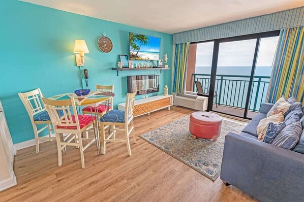 The condo itself was nice, the location was great. Right on the beach, can't beat that. The rooms were clean. Floor was nice and clean. Beds were comfortable, one soft and one firm. Couch is clean and comfortable, its a pull out. We didnt try it. The Murphy bed was very convenient. All the mattresses had plastic covers on them, which was nice! Murphy bed was also comfortable but had a smell to it. Not the mattress but the metal frame itself from being stored in the wall maybe?. Beds were clean, linens are provided. View off balcony was beautiful. I would recommend bringing a rug/mat for the balcony, its filthy. Air conditioners worked awesome! I enjoyed the clean rooms, tv, balcony and view. The cons- I didn't have any big issues with the unit besides the kitchen pots. We stayed for a week so we did cook, pots were all horrible and should all be replaced. The building/property needs attention, a deep clean, paint and repairs. There were only 4 tubes available for the lazy river and people took them to the pool.Bring your own towels. Pools were clean, hot tubs are out of order.Everyone that works there was very nice.The restaurant and tiki bar were both closed the whole week we were there, disappointed. . Overall it was a nice place to stay. Clean, which is most important.