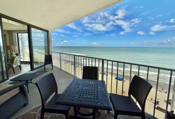 This luxurious 1240 sq. ft. 2-bedroom oceanfront condo is situated on the 6th floor of One Ocean Place . One Ocean Place is Garden City's Premier Luxury Condominium complex located just 15 minutes south of Myrtle Beach. This completely renovated unit offers magnificent views of the beach throughout. The living room is equipped witha wet bar, 60' flat screen Samsung super high definition TV with Samsung sound bar and free in unit WIFI. The room is designed with 5 panels of ceiling to floor sliding glass doors opening to a large oceanfront balcony which is also accessible from the master bedroom. The master bedroom is furnished with a 50'' flat screen TV and a new king size bed. The custom decorated master bath is designed with a huge walk-in shower with rain head and walk-in closet with a safe for your valuables. The 2nd bedroom with adjoining custom bath has 2 double beds and 32' flat screen TV. Kitchen and baths have been renovated with new shaker cabinets and granite counter tops. The kitchen is fully equipped including stainless stove, refrigerator, microwave and dishwasher and there is a in house washer/dryer.