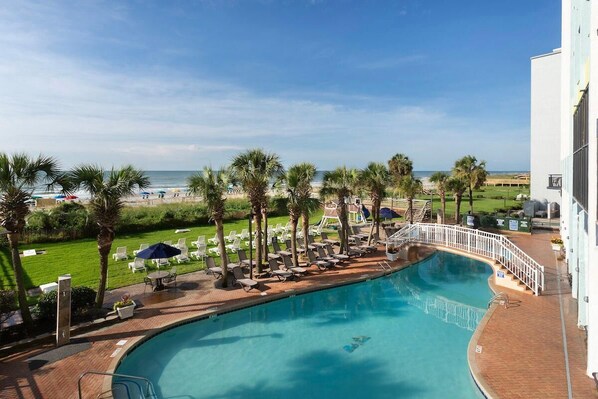 De frente para a praia, com um parque aquático