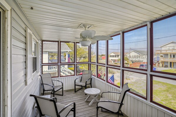 Enjoy the fresh OBX sea breeze from the spacious screened porch, complete with cozy furnishings and ceiling fans for ultimate comfort. It's the perfect spot to enjoy your morning coffee, an afternoon nap, or a sunset dinner. Outside, you'll find a charcoal park grill, basketball goal, corn hole boards, a fish cleaning sink/station, and an enclosed outdoor shower with a dressing area—perfect for rinsing off after a fun-filled beach day.