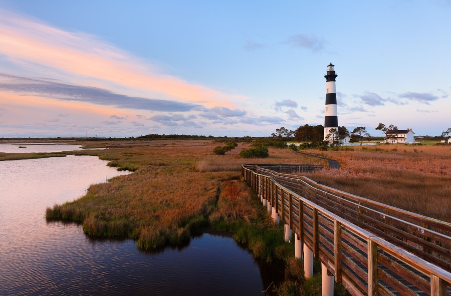 Praias vastas e dunas douradas criam um cenário perfeito para momentos ao ar livre em Nags Head. Suba no famoso Jockey’s Ridge State Park e aproveite o pôr do sol ou experimente voar de kite. Explore a icônica Bodie Island Lighthouse e tire fotos incríveis enquanto descobre a beleza da costa do Atlântico.