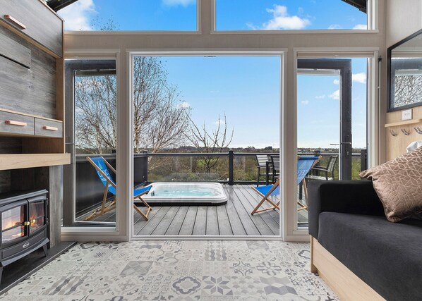 Unique styled quirky pods sleeping up to 4 people. Open plan lounge with flatscreen TV, Electric Fireplace, USB charging points, L shaped sofa. Fully equipped kitchen with cooker, 4 burner gas hob, microwave and integrated under counter fridge with freezer compartment. Large washroom with separate shower cubicle and 2 single beds in mezzanine floor. There is ladder access to the first mezzanine floor which isn’t suitable for very young children. Please note this sleeping area can be used as a double if needed but there is reduced head height in this space. Rear dining area which makes into a double bed, with bedding provided. Outside you’ll find a fabulous decked area, Outdoor Hot Tub with glass balustrading to enjoy uninterrupted views of the countryside, stainless steel BBQ, with garden tables and chairs.