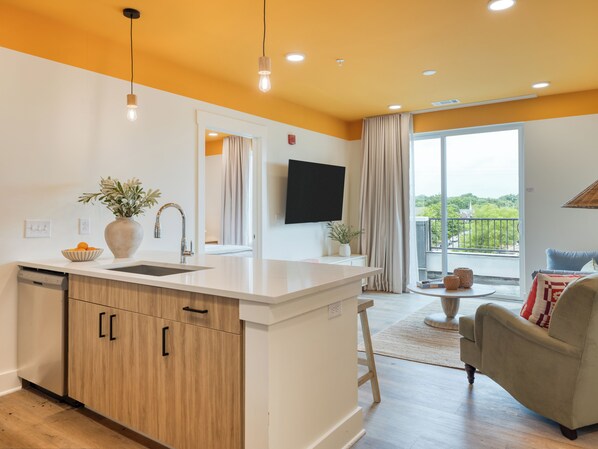 Each Two Bedroom Suite with a balcony at The Gilmore offers an ideal space for groups or families looking for extra room to spread out. Features a king-size bed and a queen-sized bed with blackout curtains, along with a living area with TV that includes a sleeper sofa for added flexibility. Large windows fill the space with natural light, creating a bright and welcoming atmosphere, and each unit also comes with a private balcony, perfect for enjoying the fresh air and views. The kitchen is fully equipped with a sink, microwave, stove, and fridge.
