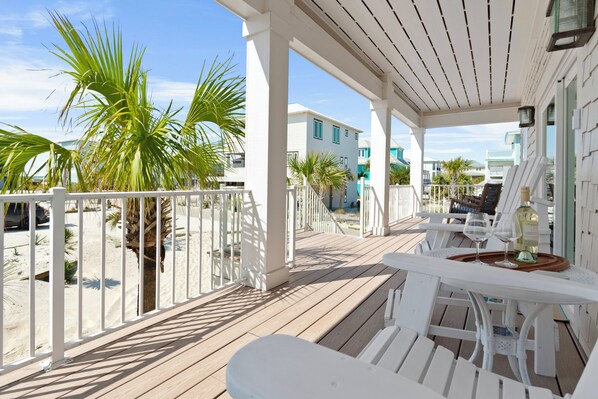 Enjoy sweeping Gulf views from the open-concept great room, where natural light pours in through expansive windows. Step out onto the large balcony that stretches the length of the house—perfect for morning coffee or evening cocktails.