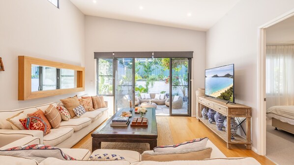 The large living space with split system air conditioning offers a place to spread out among the comfortable lounges and enjoy a movie on the Smart TV and unlimited Wi-Fi.