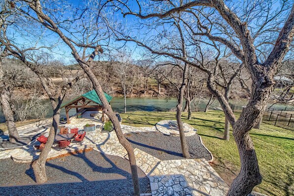This New Braunfels Home offers plenty of space! 5 Bedrooms, 3 & 1/2 bathrooms, on an acre of land between the 3rd & 4th crossing on the Guadalupe river. It has an outside shower cabana and a rec room that sports a big screen Smart TV and a Foosball table. Cook a great meal in the newly updated kitchen with granite counter tops, new back splash, stove, dishwasher and microwave! The dining table has seating for 6 and there are 6 chairs at the breakfast bar. There are also 6 padded folding chairs. The rec room has been newly renovated!! Fully enclosed, new LVP floors, fresh paint, and new AC/Heat! It also has 4 new sets of full over full bunk beds, which can accommodate 16 guests. There are 4 bedrooms upstairs; 3 with a Queen size bed and 1 with a King size bed. There is also a second living room upstairs with a smart TV and a new sofa sleeper that will sleep 2 guests. There are 2 full bathrooms upstairs and a half bathroom downstairs. The third restroom is the outside shower cabana which is newly built! High quality linens are provided for beds and bathrooms. All bedrooms have private access doors to wrap around decks, with view of the large shaded yard with beautiful pecan trees, and great view of the Guadalupe river. The upper deck also has two benches and a swing. The living room and the rec room have Smart TV's and there is Wi-Fi. Enjoy sitting down by the river in the brand new pavilion where the owner has placed a very high end fire pit (fire wood not provided) for your enjoyment as well as a propane grill! Jump in the wonderful Guadalupe with your direct river access! There are also 1 kayak and 2 canoes for your use! There are no life jackets provided, so be sure to bring a couple with you. The closest tube outfitter to the home is Little Ponderosa Outfitters which is just .4 miles away! Head on up to the Horseshoe and float right to your own backyard! 12 miles down river road to the historic Gruene Hall, and many restaurants, 3 miles up river to Canyon Lake. Sattler is the closest town at 2.5 miles away, with a grocery store that stocks everything from a sandwich to an inner tube. There are many breakfast and BBQ places in the area as well! Host must be 25 years of age or older to make a reservation and must be staying at the property. No pets allowed. This home has a maximum occupancy of 26 guests. This maximum occupancy is not to be exceeded at any time. No daytime guests allowed. You can park up to 10 vehicles at this property. To comply with city and county short-term rental permit restrictions, the outdoor areas of this home are monitored by video camera. This property includes accidental damage protection up to $3000. WORD permit #L1364