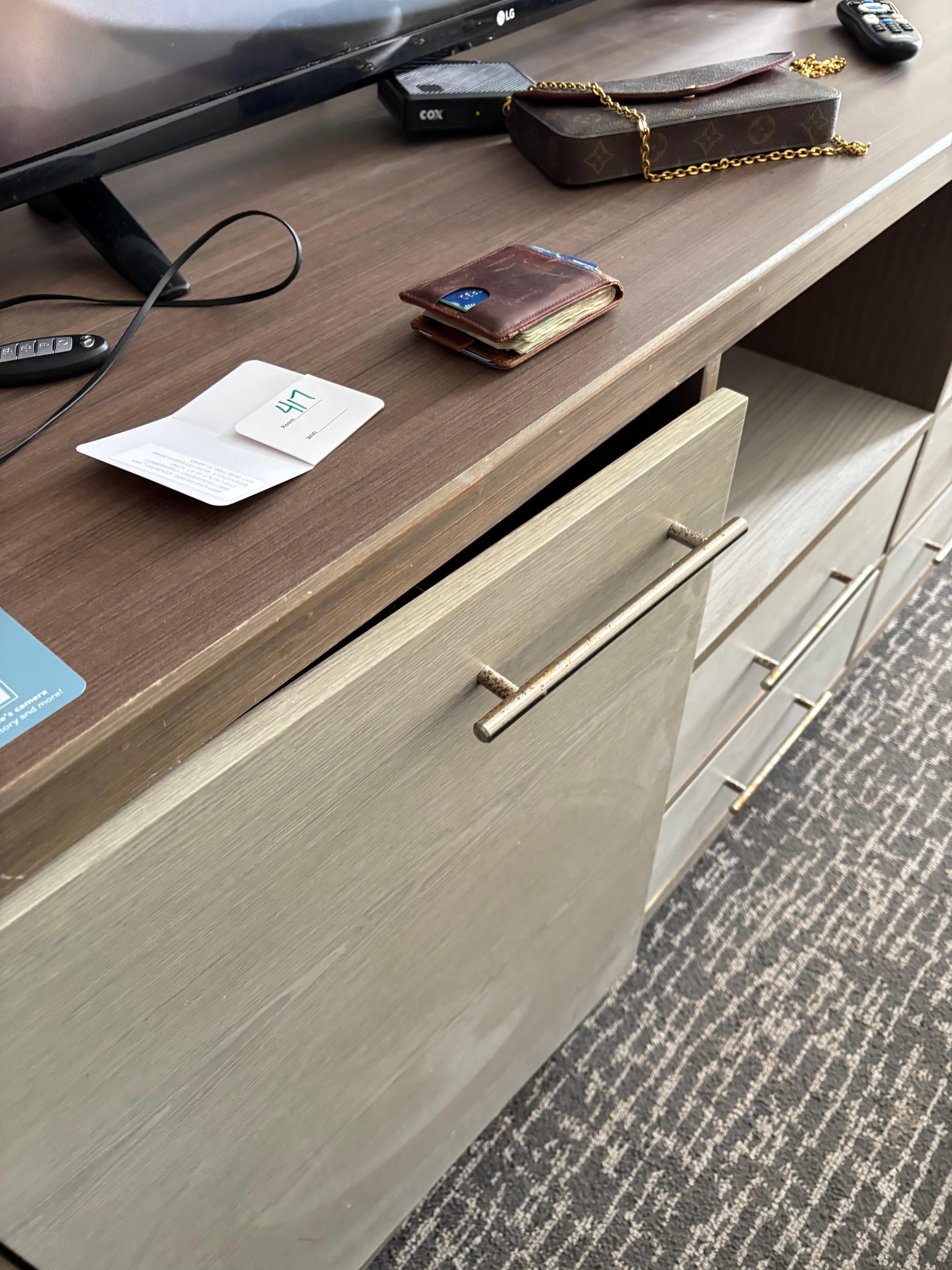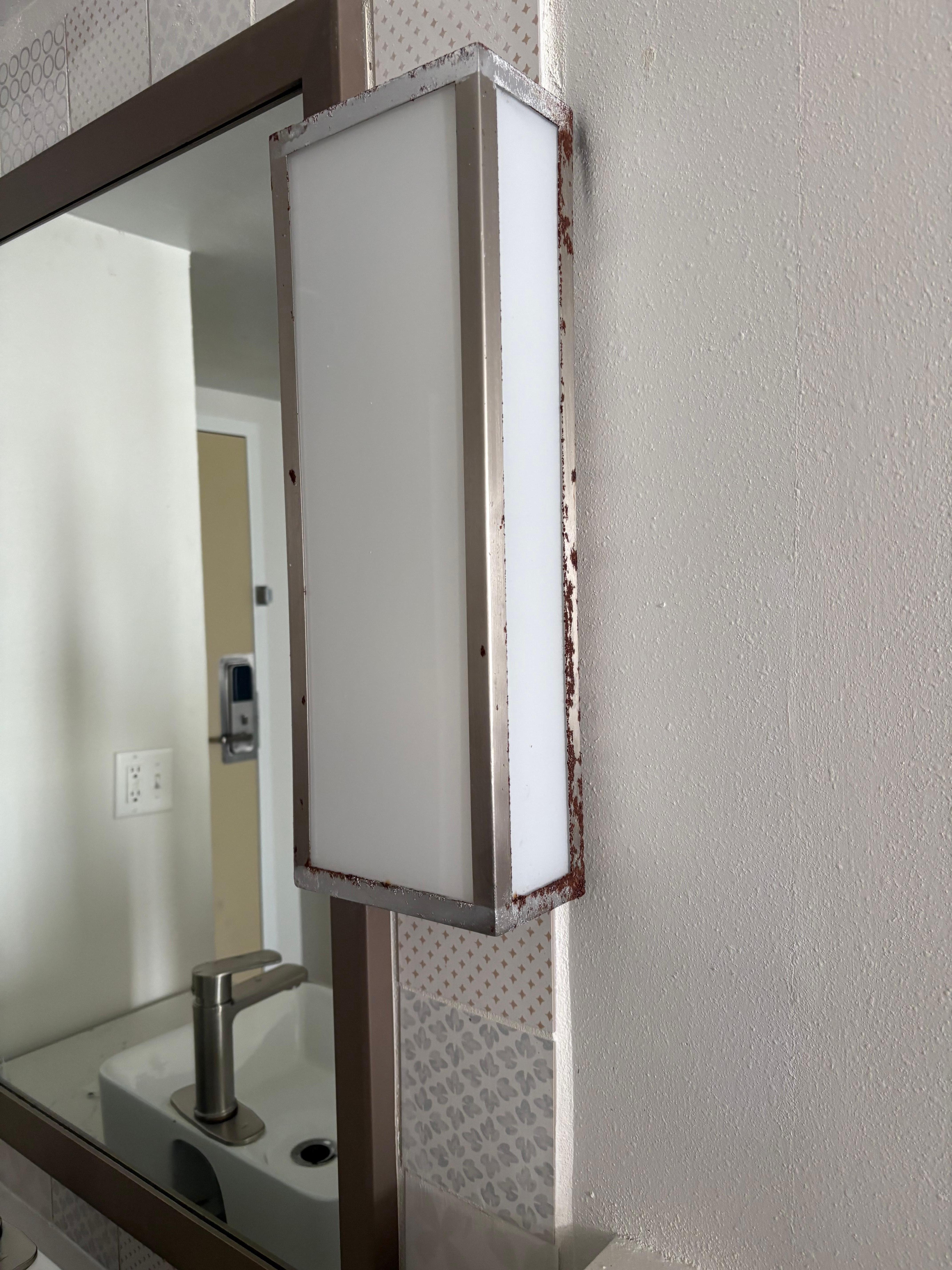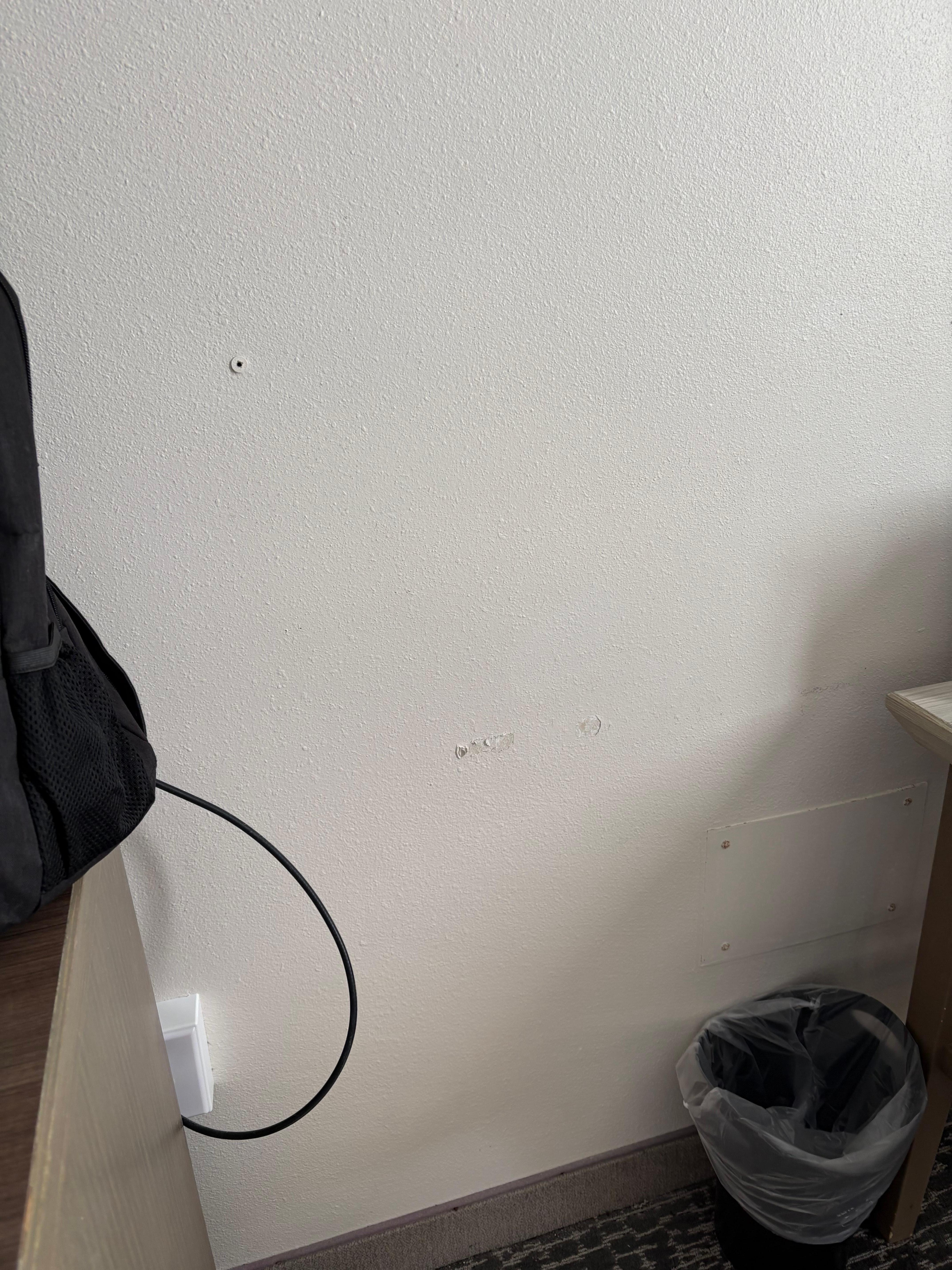 Room had curtains that were as wrinkled as a discount bin at a Thift shop, we were missing a black out curtain so there was no block out of light. Rusted lights, handles, broken cabinet door, holes in the wall were the highlights.