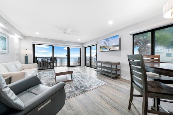 Welcome to Shorehom by the Sea #34! This fully renovated, luxury corner condo is a true gem, offering unparalleled direct oceanfront views of No-Drive New Smyrna Beach. Sunlight pours into this southern-facing property, creating a bright and inviting atmosphere throughout. The updated kitchen and bathrooms feature modern finishes and top-of-the-line appliances, ensuring your stay is as comfortable as it is stylish. Gather in the dining room at the high-top table, where you can enjoy meals with a backdrop of stunning Atlantic Ocean views.