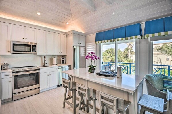 KITCHEN: Fridge, stainless steel appliances, kitchen island, breakfast bar, stove & oven, dishwasher, cooking basics, dishware & flatware, microwave, Keurig coffee maker