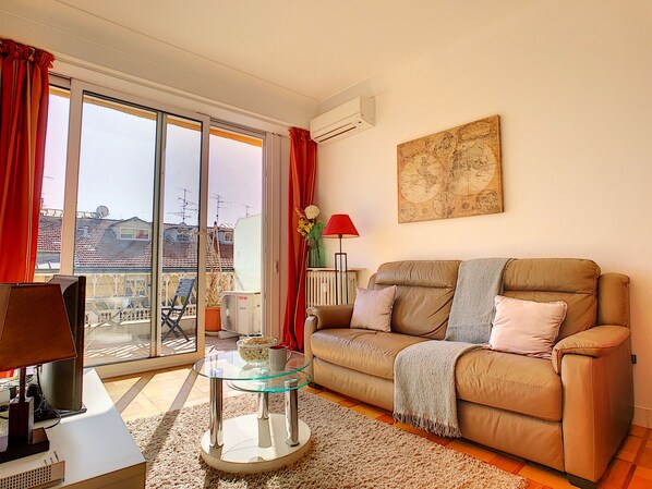 Air-conditioned living room opening onto the terrace, equipped with a flat screen TV.