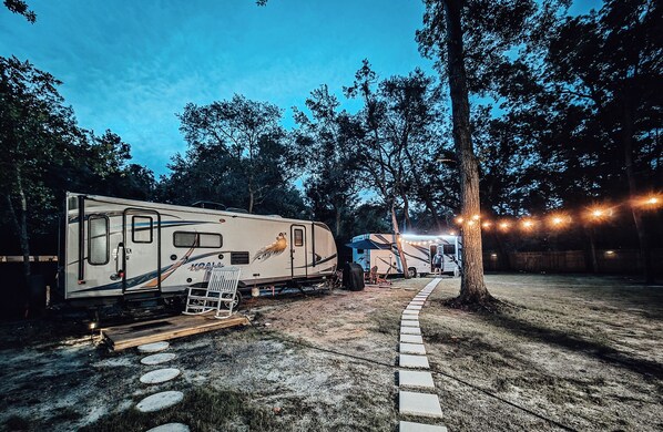 The pathway leading to the camper is well-lit at night, providing extra visibility and peace of mind.