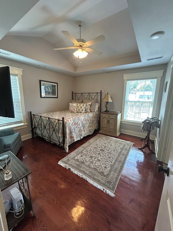 Family friendly, 3 bedrooms, 2 baths with hardwood floors throughout. Fully equipped kitchen with granite counter tops and stainless-steel appliances: gas range, George Foreman grill, toaster oven, and waffle iron. Coffee & a selection of teas provided. Pots, pans, slow cooker, baking supplies including a hand mixer & bowls. Dishes, silverware, paper plates & bowls, napkins & paper towels provided. Grill, charcoal & lighter fluid provided. Beach bag, towels, toys, chairs & cooler. Master suite has a TV, tray ceiling, walk in closet & dual vanity in bathroom. 2nd bedroom has a TV & private reading nook. 3rd bedroom has a work desk and wireless HP printer. Laundry room equipped with detergent, fabric softener, dryer rack, iron & ironing board. Relax in the rocking chairs on the covered front porch with ceiling fan. Watch soccer practice from the porch or walk across the street to catch a softball game.