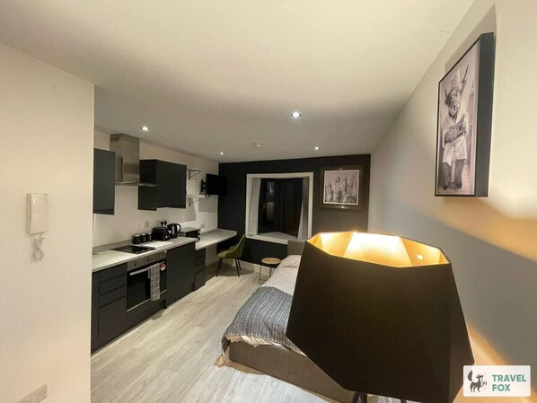 This stylish studio style flat features a double bed, kitchen, and ensuite bathroom. The building has its own gym, shared laundry room, and high speed internet. Conveniently located with free street parking around the corner, this flat is perfect for contractors. This studio is on the ground floor.