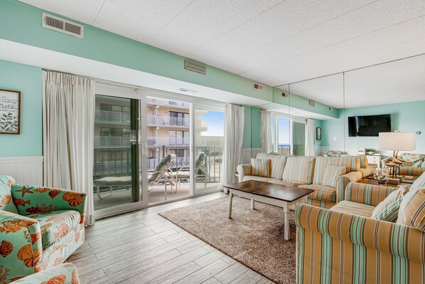 Discover the perfect beach getaway at this contemporary vacation rental, highlighted by an oversize, furnished balcony with scenic ocean views. Just 100’ from the sand, the newly updated Blue Sea Colony building provides an elevator and a desirable midtown locale. Walk to the convention center, eateries, amusement parks, the bayside, and more.
