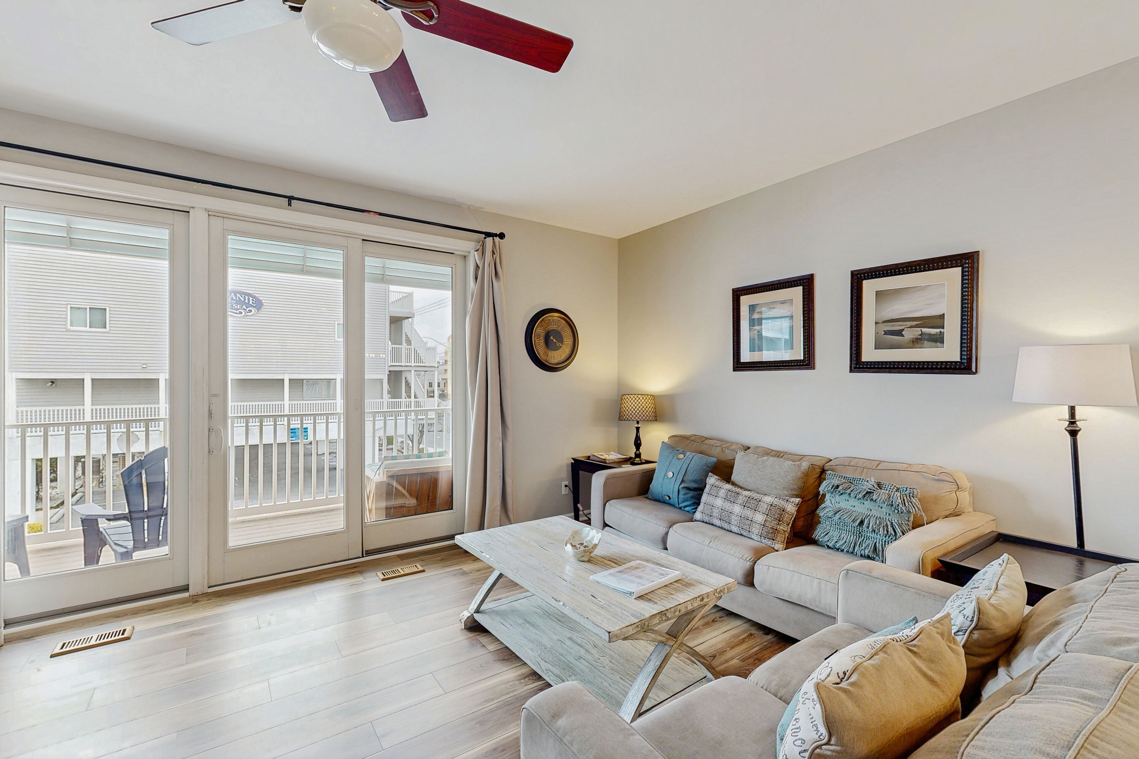 Look no further than this lovely, four-story townhouse in the gated community of Sunset Island! This-five bedroom home is sure to please, offering a spacious kitchen and dining area, as well as a breakfast bar and an adjoining morning room to provide even more seating. You'll find two master bedrooms here as well - perfect for when large groups or families are traveling together. Additional luxuries include four TVs, two DVD players, a VCR, plush furnishings, a full-size washer/dryer, free WiFi, and parking for three vehicles. Take a leisurely walk to the on-site pools, clubhouse, or general store, where you can purchase a great cup of coffee or a bottle of fine wine. Or, simply stay home to relax with a drink on one of the rear balconies or the charming front porches with fountain views.