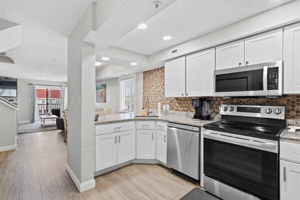 Large updated townhome with a prime location in Ocean City, Maryland. This townhome offers three bedrooms, three full-bathrooms, one half-bathroom and an open living area. The living area features the living room with a sleep-sofa and a fireplace, dining area, fully-equipped kitchen and a half-bathroom. The home’s end-unit location lets in a lot of nice natural light for an open feel. There is a large furnished balcony off of the living area that is a great place to relax and unwind after a long day on the beach. The first bedroom features a full-sized bed, television, balcony and an ensuite full-bathroom. The second bedroom features a single bed and a single-over-double bunk-bed with an adjacent full-bathroom. The third bedroom features a double-bed, single foldout bed, television, balcony and an ensuite full-bathroom. Building amenities include onsite parking, a community deck area for eating crabs and water access for launching kayaks or standup-paddleboards. The beach, amusements, shopping, restaurants, coffee shops, Ocean City Convention Center and more are all nearby. Come make some memories at the beach with Coastal Life Vacations. Linen and towel package included with reservation. Management fee includes Damage Waiver for $1000 in accidental damage coverage.