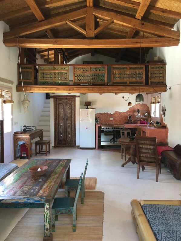 The Mezzanine has a floor of precious wood and a king size bed. A double bed plus a single sofa-bed in the living room. Both double beds are made in bamboo with natural kapok mattresses that will enhance your sleep. The single bed is in teak. Two bright verandas overlooking the small town of Arzachena and the surrounding hills.
