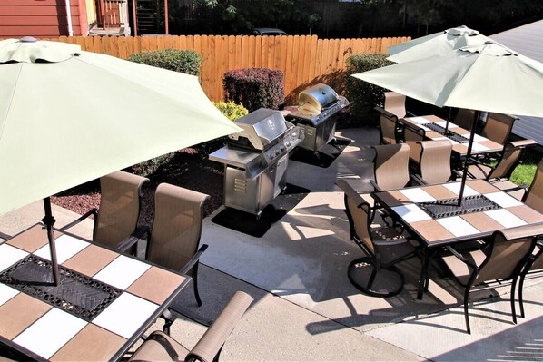 The inviting wrap around covered porch is the perfect place to unwind after a long day at the ballpark. Guests especially enjoy relaxing in the extensive patio area in the rear, which is complete with gas grills and plenty of outdoor dining area.
