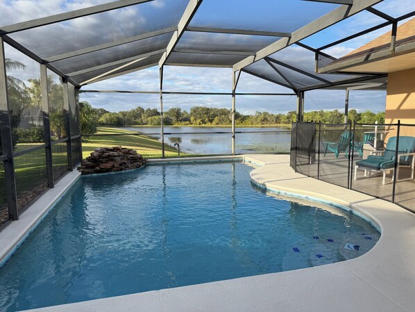 Outside, the professionally landscaped area with palm trees and other greenery overlooking the waterfront area add to the peaceful wildlife surroundings. The stunning sundeck area with a waterfall built into the pool area and covered patio with quality tables, sun loungers and chairs all provide ample opportunity to enjoy the Florida climate. NEW extended lanai area allows for full enjoyment of the lake during the entire day and evening.