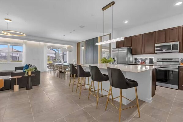 The fully equipped gourmet kitchen features stainless steel appliances, granite countertops, two refrigerators, and two dishwashers, making it ideal for large groups. Share meals at the oversized dining table or breakfast bar, then relax in the open-concept living area with plush seating and a large Smart TV.