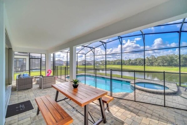 Step into your private screened patio to enjoy the sparkling pool and soothing hot tub. Fire up the BBQ grill for outdoor dining or unwind on lounge chairs surrounded by peaceful lake scenery, perfect for sunny afternoons and relaxing evenings.