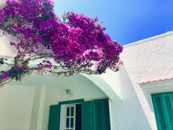 Set on a 600 m² private property in Lido Fontanelle, the villa features a private driveway leading into a shaded pergola surrounded by a lush Mediterranean garden with a tall palm tree, magnolia, ficus, lemon trees, hibiscus, and roses. A stone-paved walkway leads to the veranda, covered in vibrant bougainvillea that gave the villa its name. The spacious terrace is partly shaded and partly sun-drenched - perfect for relaxing outdoors. Garden furniture and an outdoor shower are available, and an external staircase leads to a rooftop terrace with a partial sea view.